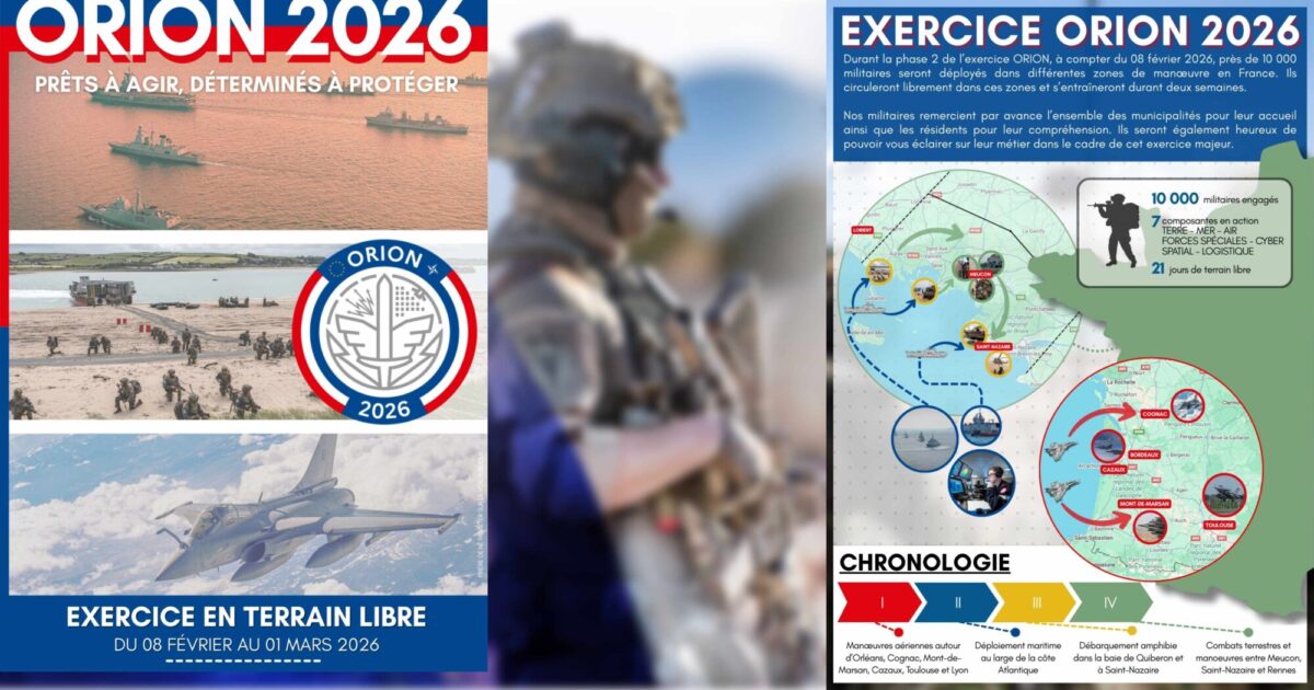 Durant la phase 2 de l’exercice ORION, à compter du 08 février 2026, prés de 10 000 militaires seront déployés dans différentes zones de manœuvre en France. Ils circuleront librement dans ces zones et s’entraîneront durant deux semaines.