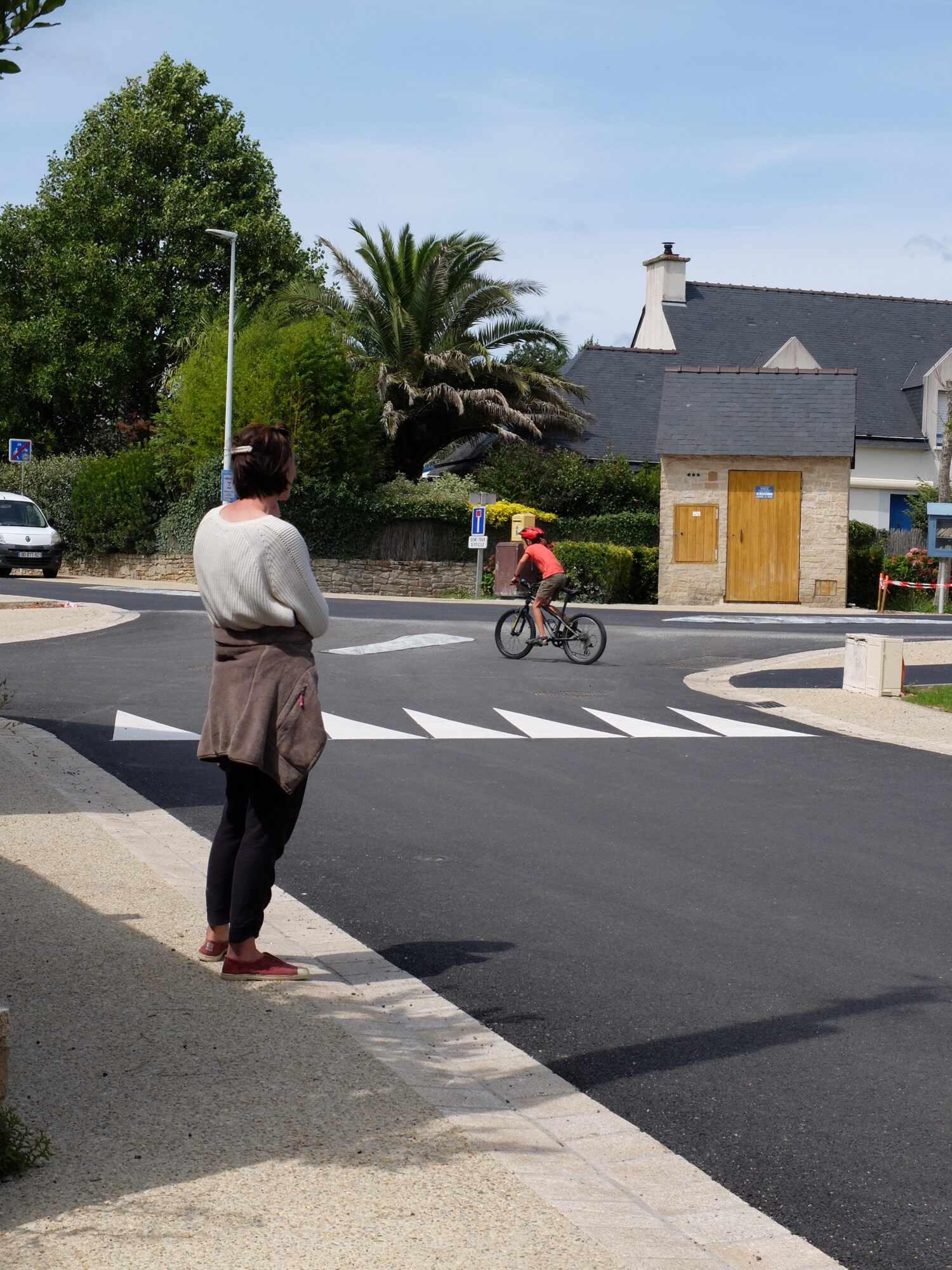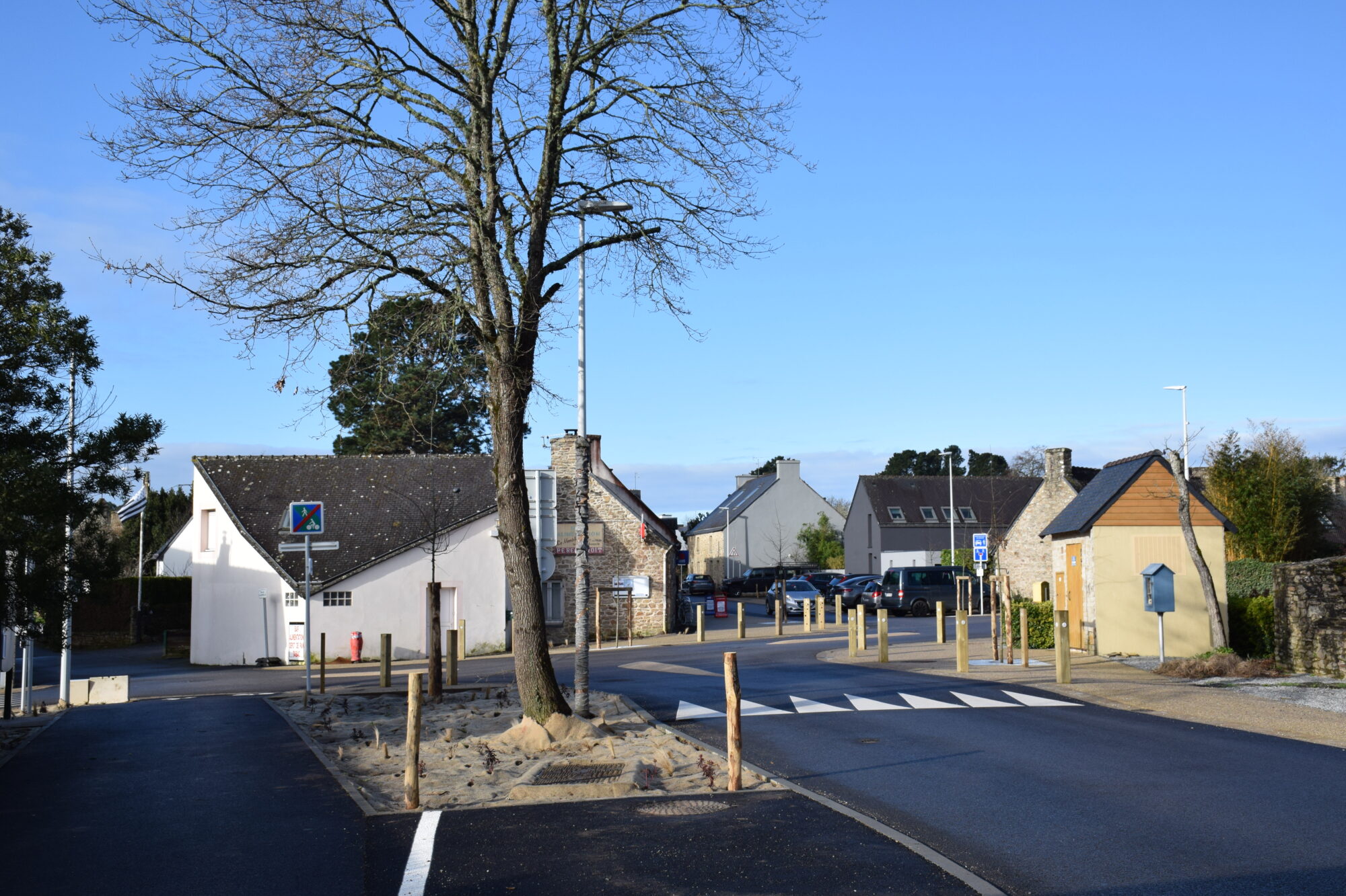 Le béton désactivé beige, au niveau du carrefour de la rue du Moustoir, (en dehors des places de stationnement minutes matérialisées par un marquage au sol) est une zone piétonne. Il y est donc formellement interdit de s’y stationner. Des potelets en bois permettent de sécuriser les cheminements piétons.